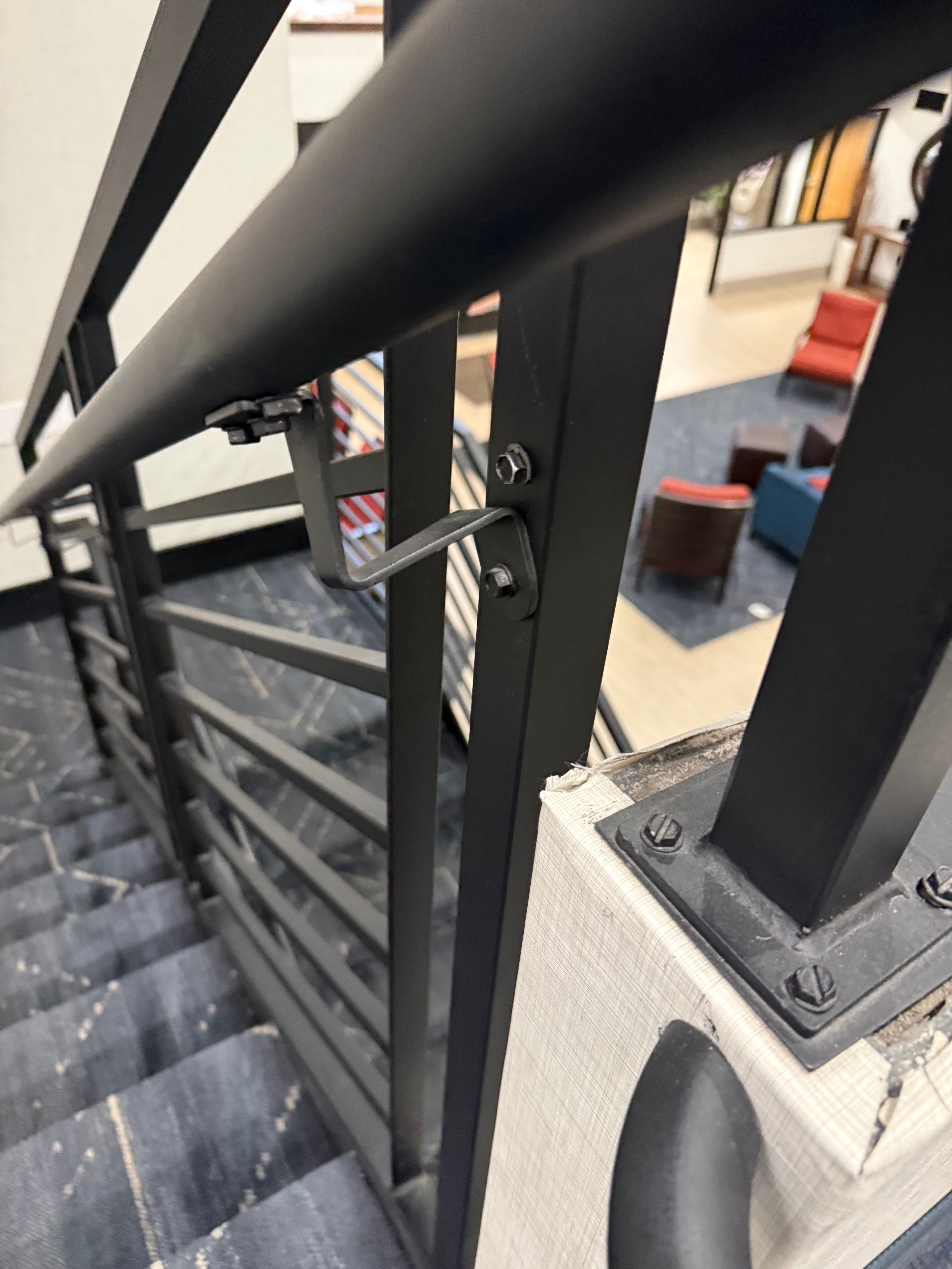 The two sections of railing met at a landing. They hadn't bothered to join them properly—just butted together with a visible gap and bare metal showing where paint should be. No weld, no proper connection, just hoping nobody notices.