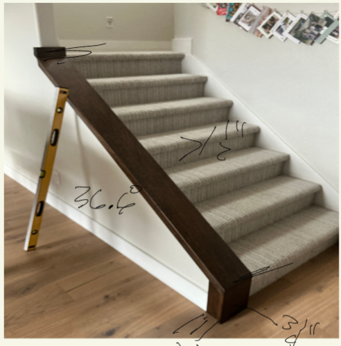 We're designing a steel post-and-rail system that'll anchor to the stairs and support that wood cap. The measurements we're working with show a 36.6-inch rise and roughly 31.6-inch run per section, with a 21.5-inch total stairway span. Posts will be positioned to prevent any gaps larger than 4 inches (the code requirement for preventing small children from slipping through) while keeping the visual lines clean.